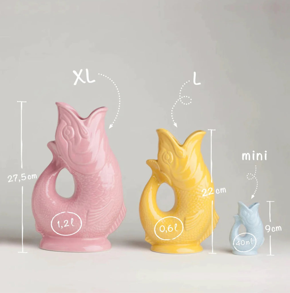 Die original Glucki-Gluck Fischvase ist nun endlich auch in der mini Version bei uns im Répertoire eingezogen. Die Vase, welche auch als Karaffe verwendet werden kann, macht beim Eingießen ins Glas ein gluggerndes Geräusch. Damit ist sie nicht nur dekoratives Highlight, sondern bereitet auch großes Staunen, wenn der Fisch anfängt Geräusche zu machen. Der Fisch eignet sich auch perfekt als Weihnachtsgeschenk. Die Mini Version eignet sich perfekt als kleine Schwester von den großen Glucki-Glucks, oder als kleines Milchkännchen, mini Vase und für vieles mehr!