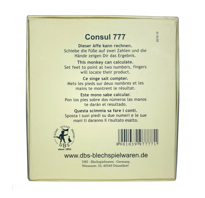 Einst als Rechenhilfe auf den Markt gebracht, entlockt er noch heute dem Betrachter ein: "Das gibt`s doch nicht!". Schiebe die Füße auf zwei Zahlen und die Hände zeigen das Ergebnis. Der schlaue Affe kann bis zu Faktor 12 multiplizieren.