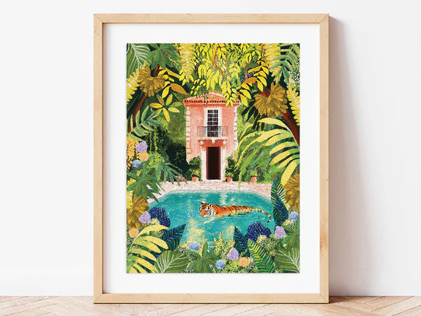 Machen Sie Urlaub von Zuhause und versetzen Sie sich in eine Villa inmitten eines Dschungels mit einem Tiger als Haustier. Entdecken Sie Inspiration und lassen sie Ihrer Kreativität freien Lauf, indem Sie Farben auswählen und das Gemälde personalisieren.
